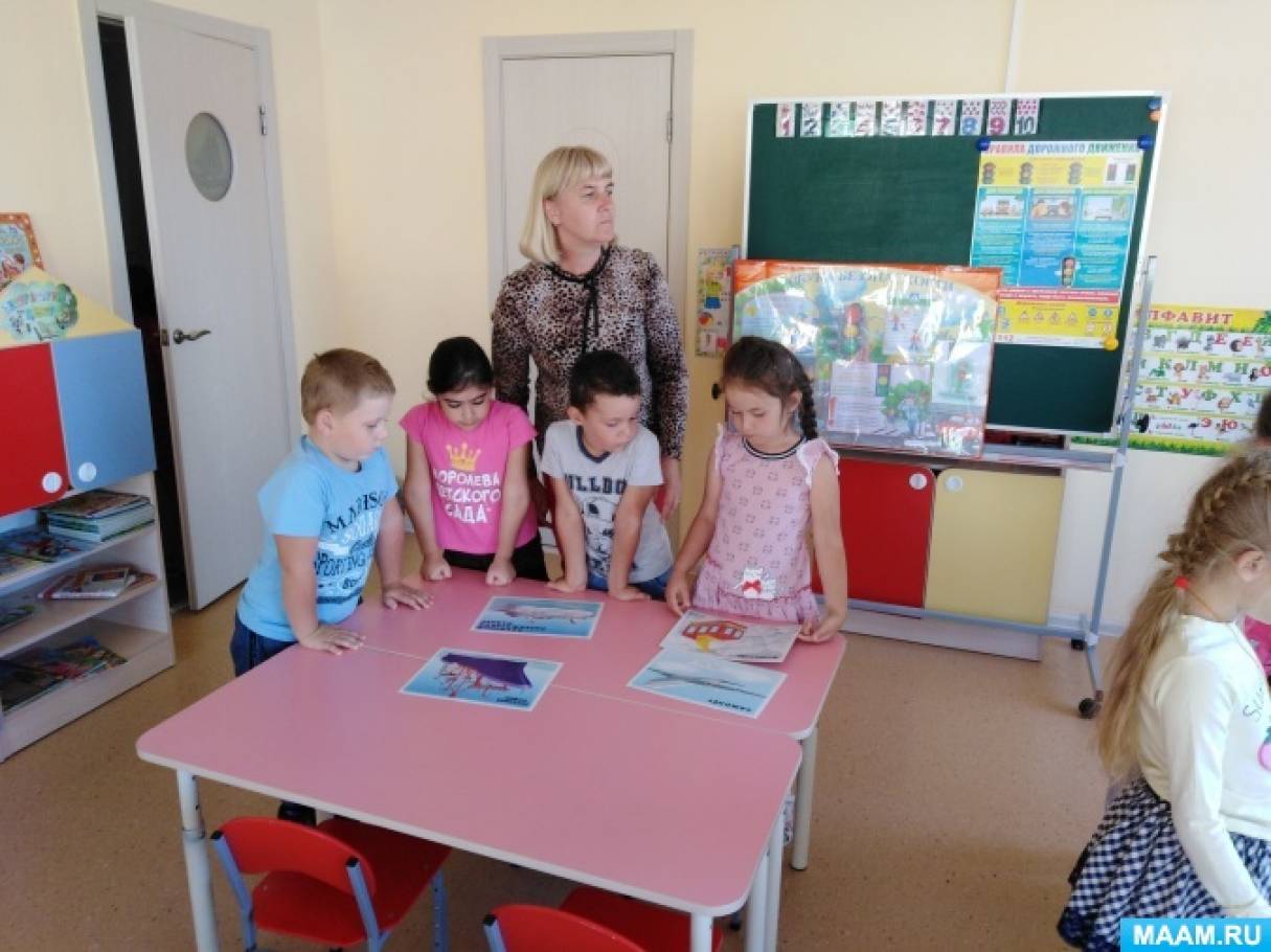 Материал: Большой цветик – Семицветик, иллюстрации с изображением дорожных ситуаций, дорожные знаки на каждого ребенка, разрезные знаки, листы бумаги и цветные карандаши на двух человек, макеты дорожных знаков, карточки – «Транспорт».