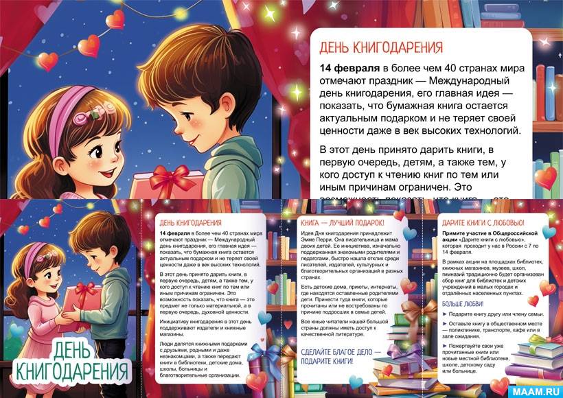 Папка-передвижка к празднику "Международный день дарения книг" или "День книгодарения" (14 февраля). Консультация для детей и родителей: история праздника, традиции праздника, акция "Дарите книги с любовью!".