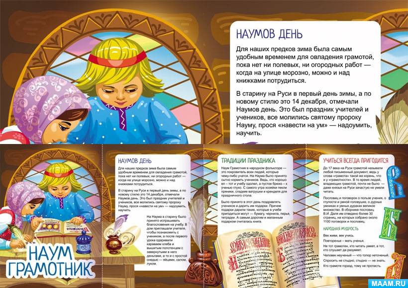 Папка-передвижка для родителей и детей к празднику Наумов день. Информация о празднике, традициях древней Руси, о грамотности.