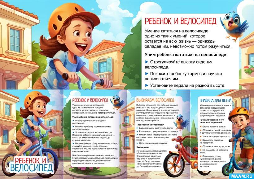 Папка-передвижка для родителей "Ребенок и велосипед" с консультацией, как научить ребенка кататься на велосипеде, как правильно подобрать велосипед и правила безопасности для маленьких водителей.
