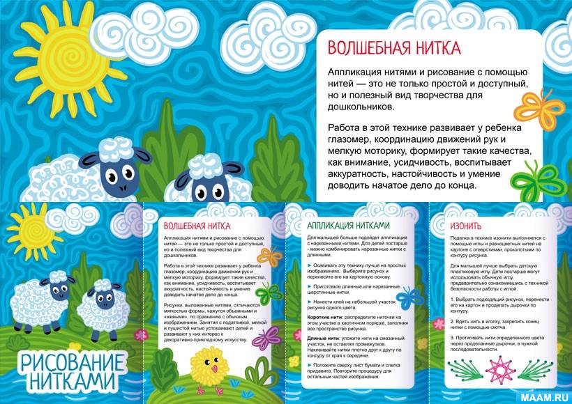 Папка-передвижка для родителей дошкольников о технике рисования нитками: аппликация из ниток, изонить.