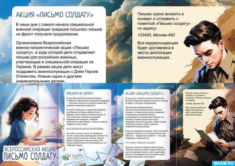 Папка-передвижка с информацией об акции Письмо солдату и историей писем на фронт. Распечатайте передвижку для родителей и детей и примите участие в акции.