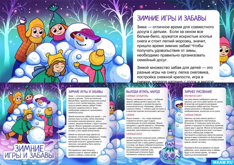 Зимние игры и забавы для детей - папка-передвижка для родителей с консультацией во что можно поиграть с детьми зимой в снегу.