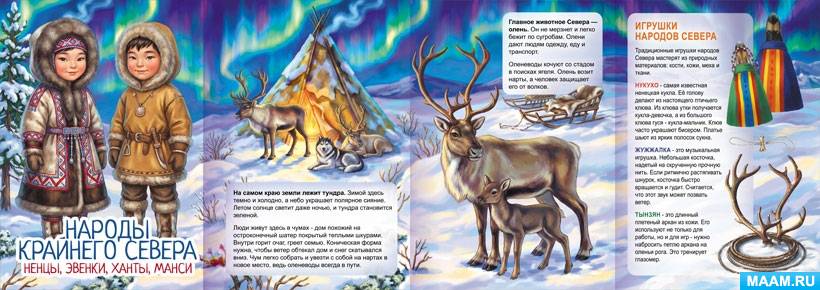 Главное животное Севера — олень. Он не мерзнет и легко бежит по сугробам. Олени дают людям одежду, еду и транспорт.