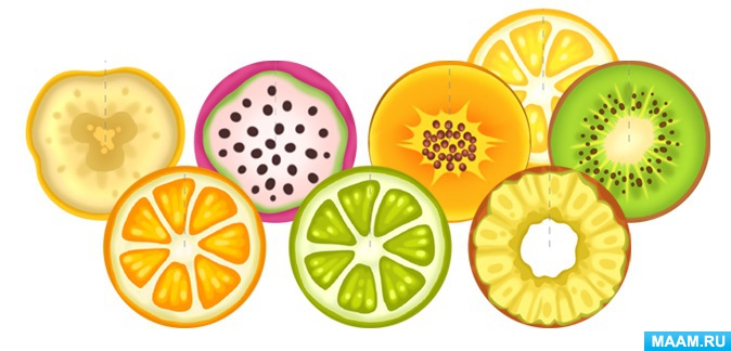 Инструкция на картинке: распечатайте, вырежьте карман, кружочки фруктов, полоску-держатель для фруктов.